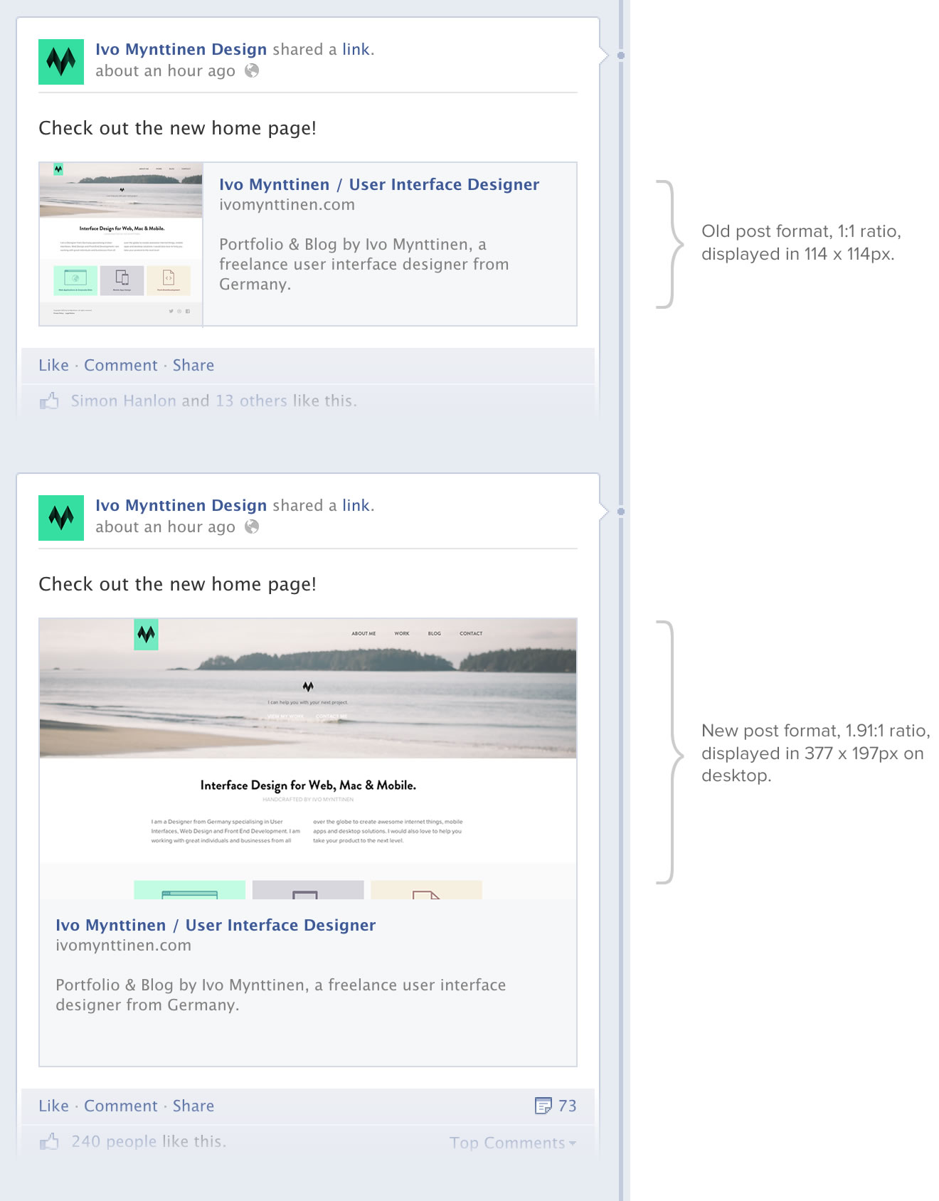 The image itself should be 1200 x 630px in size, or at least 600 x 315px (non-retina). Older images with the 1:1 aspect ratio and smaller resolutions are still compatible but will be displayed in the old post format.